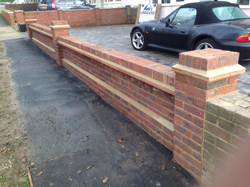 We removed the old driveway and brickwall, cleared all the debris and laid down a solid base. We laid the drive with Brett Regatta silver haze blocks. We also laid crved steps and a curved flower bed. The wall was built using Hoathley handmade bricks.
